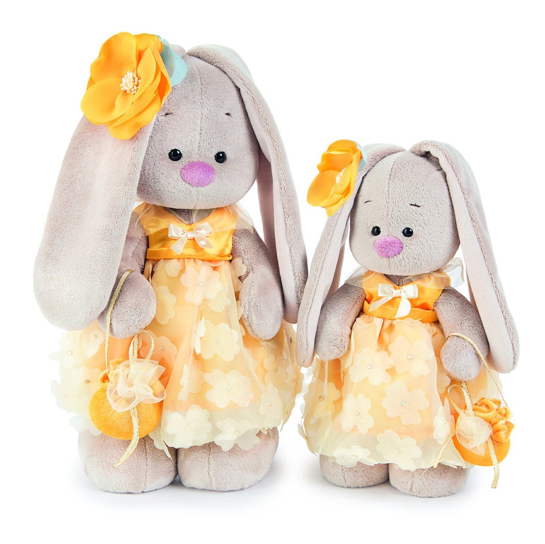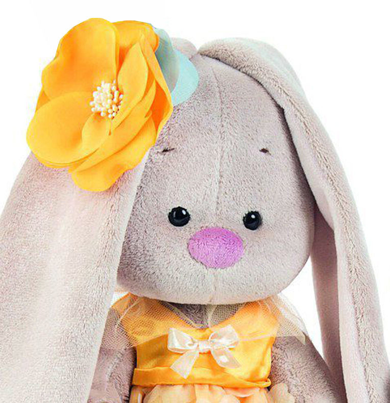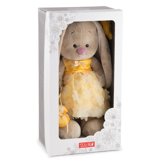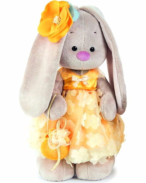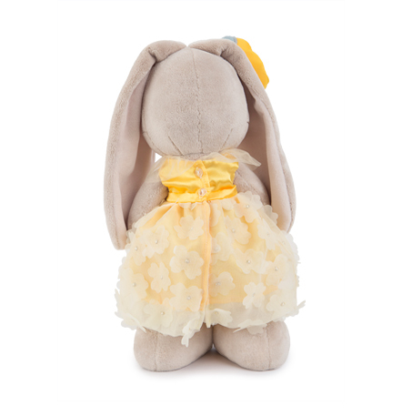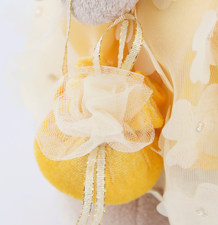 Участницей под номером "3" на конкурсе цветов стала Зайка по имени Амели. Кстати, в переводе с французского Амели означает "цветок"! Для конкурсного выхода Амели выбрала платье из жёлтого сатина и воздушной ткани, которое украшено цветочками, атласным бантиком и воротничком из сеточки. Также, как и остальные участницы, она должна показать свое безупречное чувство стиля и цвета. Поэтому к платью была выбрана бархатная сумочка с цветком из сеточки и золотистыми лентами, а ушко Зайки украсил оригинальный цветок из ярко-жёлтого атласа с бусинками-тычинками.