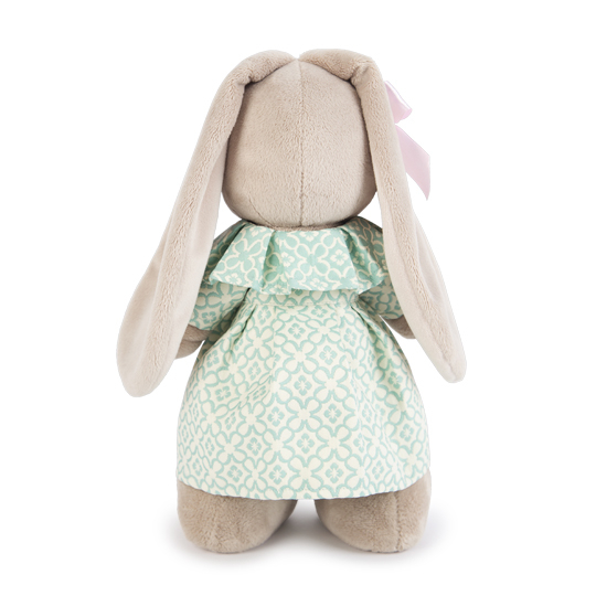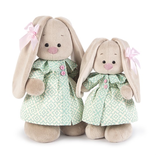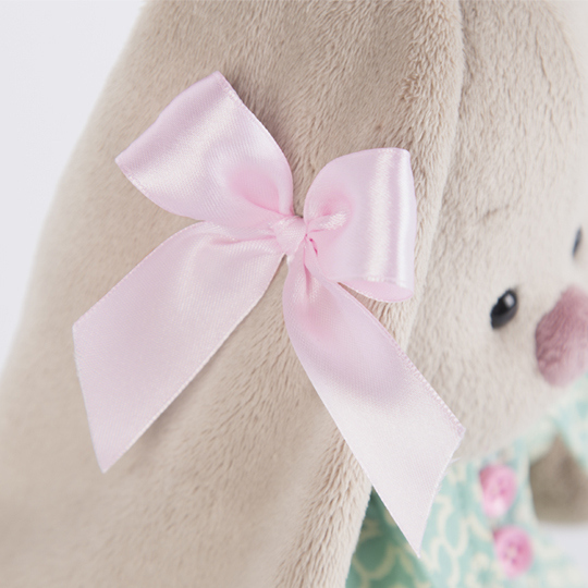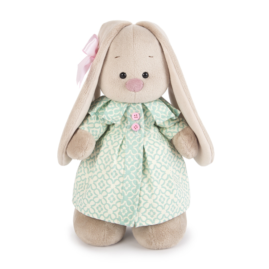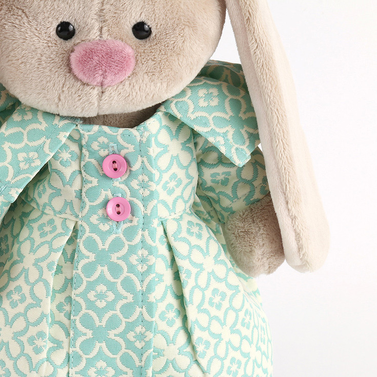 Сегодня вечером Зайке Ми предстоит очень важная встреча, которая состоится в летнем кафе. Но, к сожалению, погода выдалась немного прохладная и вот-вот пойдет дождик. На такой случай у Зайки Ми есть легкое летнее пальто из плотного жаккардового хлопка нежно-бирюзового цвета со сложным контрастным орнаментом, по фасону очень напоминающее платье, с яркими розовыми пуговками. Вот оно, как нельзя лучше, подойдет на эту встречу. А чтобы завершить образ, ушко Зайка украсила атласным бантом нежно-розового цвета. Наряд получился безупречным!