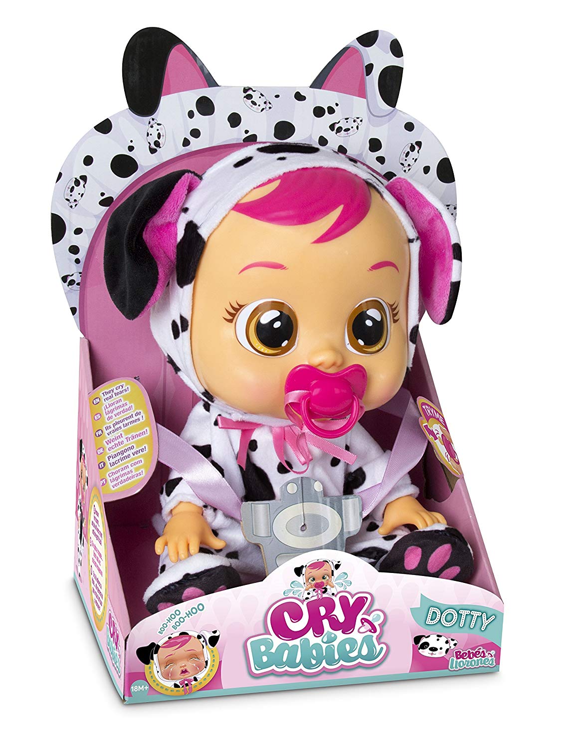 CRYBABIES Плачущий младенец Дотти от известного бренда IMC toys. Роскошный младенец с соской в костюме далматинца. Функции: Плачет настоящими слезами, просто заберите у куклы пустышку и она начнет плакать, совсем, как настоящий ребенок. Издает различные звуки во время плача, всхлипывает или рыдает. Если малышке предложить пустышку, она сразу успокоится. Также перестает плакать когда ее укладывают на спину. Перед игрой необходимо наполнить резервуар, который находится на затылке куклы, предварительно вставив соску в рот куклы, во избежание вытекания воды Внимание, вода для резервуара должна быть очищенной бытовыми фильтрами. Высота куклы 31см. Для работы необходимы 2 батарейки LR03 (AAA) 1.5V.